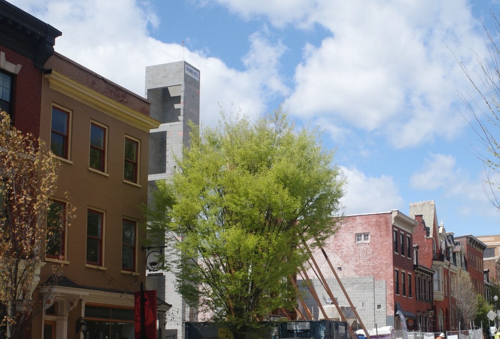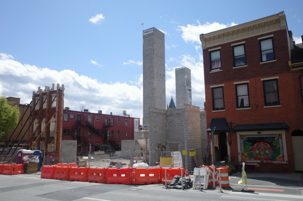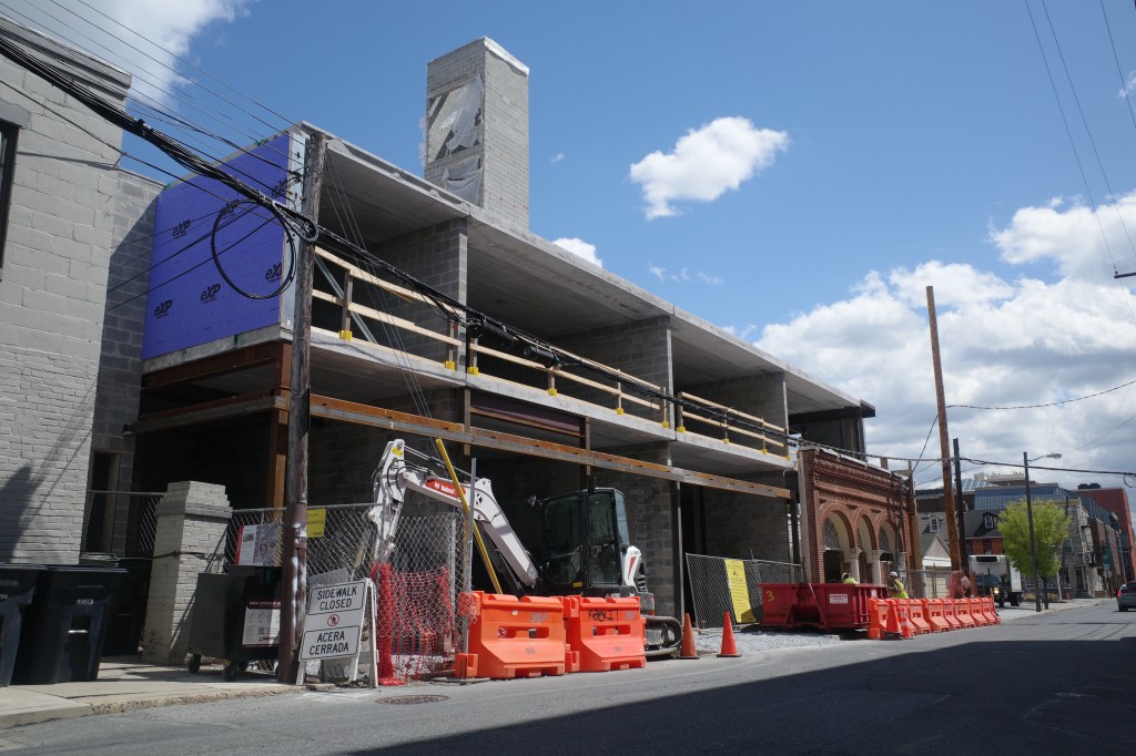 The historic facade of the the former Teachers Protective Mutual Life Building stands propped up on N. Prince Street while the new building’s core has now reached it’s full seven-story height and retail space along Water Street begins to take shape.