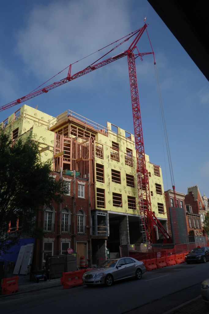 A tremendous amount of progress has occurred since our last update in April, when only the building core stood higher than two stories. The superstructure now stands constructed to its final floor, with practically all of the DensGlass sheathing board in place which will be clad in part with brick to match the preserved facade of the former Teachers Protective Mutual Life Building.
